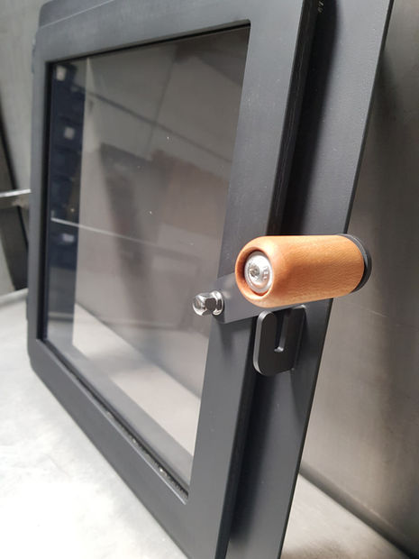 La vitre arrive pré-montée. De plus il n’y a aucun contact entre la vitre et le métal, car la vitre est protégée sur les zones de contact par de la tresse céramique et maintenue intégralement par une parclose. Les contacts métal/vitre sont les endroits de fragilité qui ont tendance à faire casser la vitre à la longue.